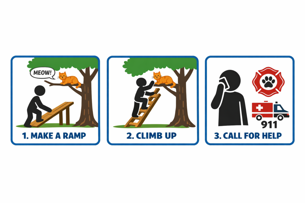If the cat isn’t too high, you can lean a sturdy board or long object against the tree to form a ramp. This gives the cat a safe, gradual path downward. It works best for cats who are hesitant, not panicked.
